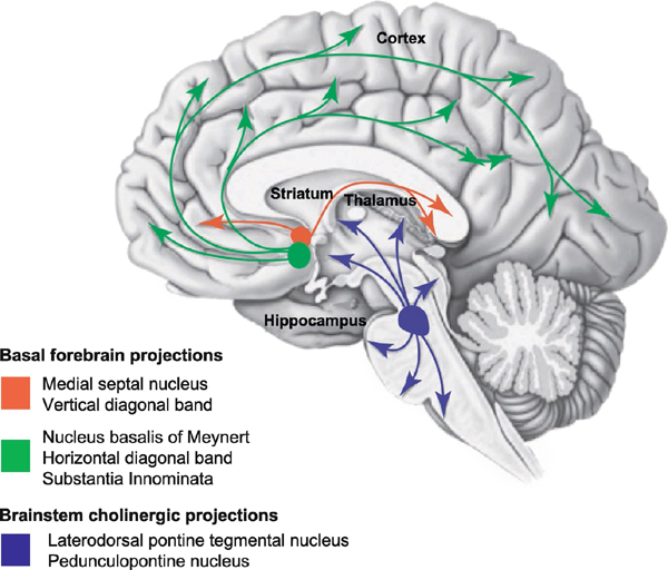 Cholinergic neurons are localised in the basal forebrain and pontomesencephalic tegmentum (PMT) nuclei. The PMT nuclei send projections to the spinal cord, thalamus, basal forebrain and frontal cortex. Auditory stimuli,activating the primary auditory cortex, may be able to affect the activity of cholinergic neurons in the PMT, influencing various functions such as arousal, the sleep-wake cycle, motor control, and motivation and reward behaviour.